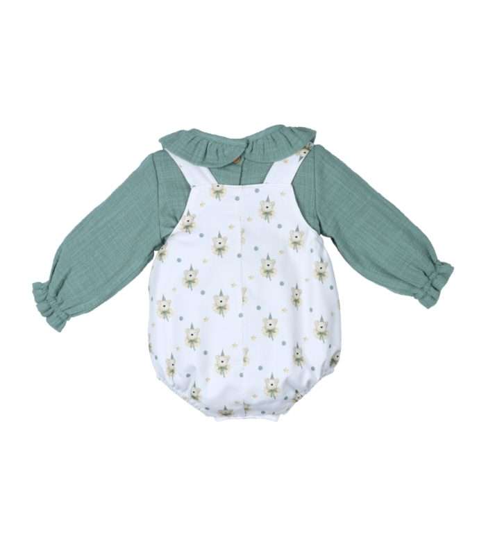 Conjunto ranita estampado osos con blusa cuello volante en verde seco a juego.