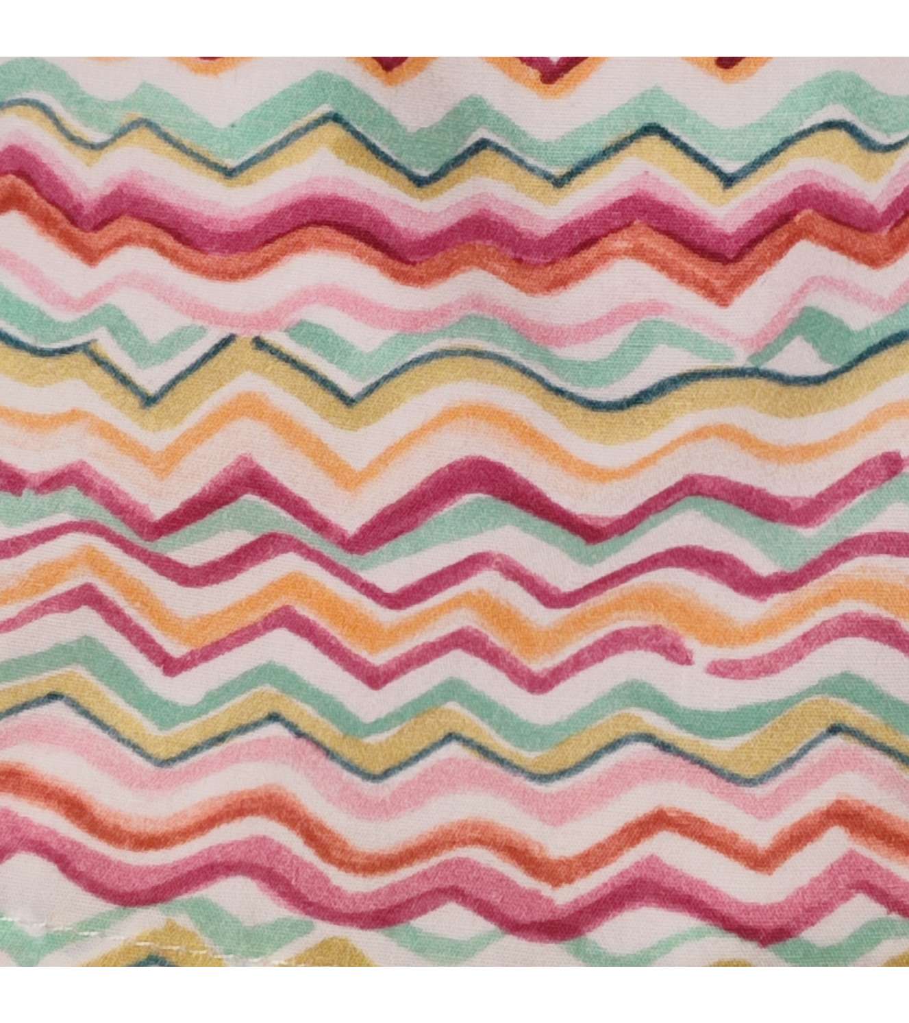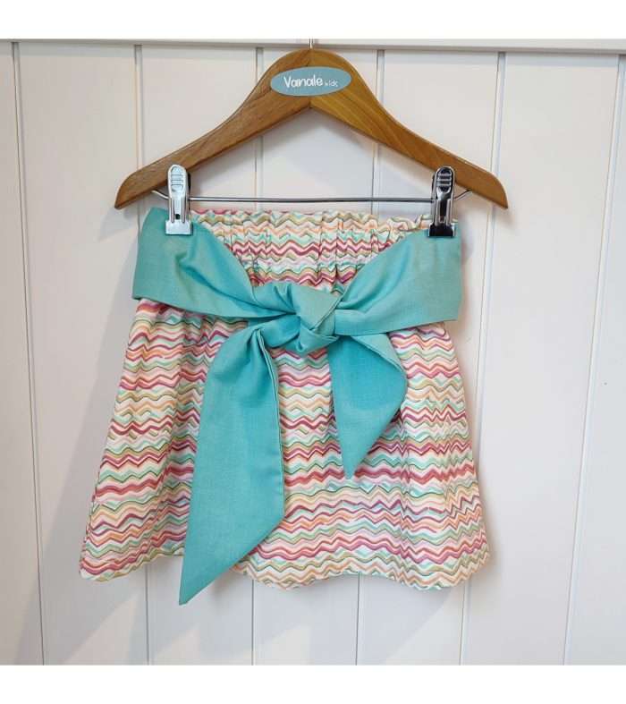 Falda estampado zig zag colores cintura engomada, fajín lino verde.