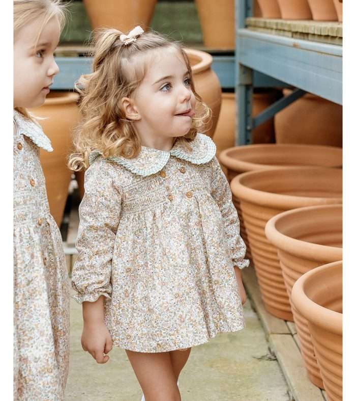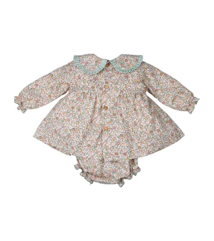 Jesusito estampado flores cuello bobo viveado en vichy verde, cubrepañal a juego.