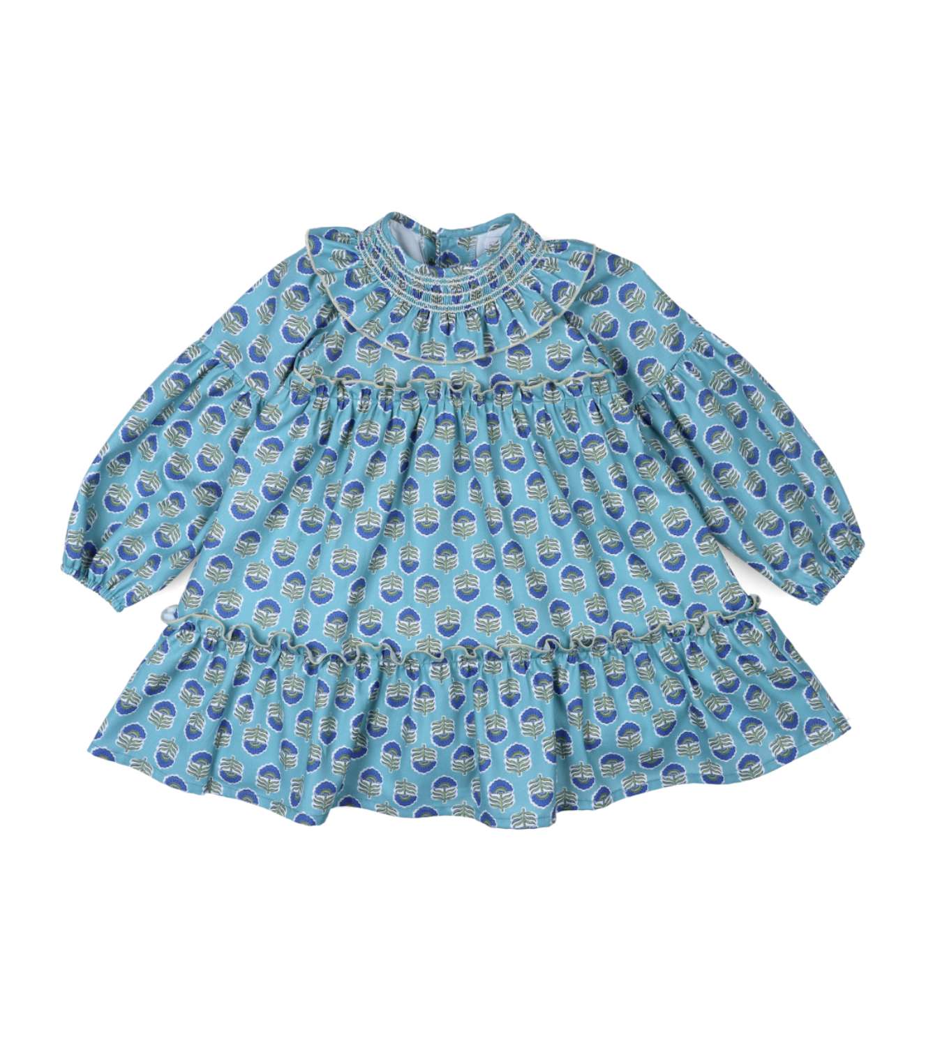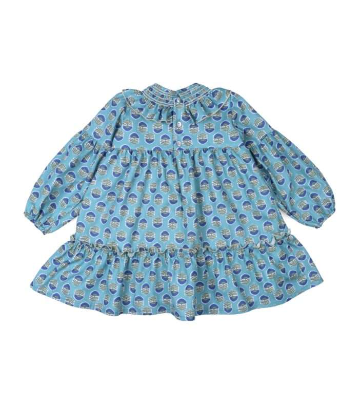 Vestido azul manga larga estampado ramilletes azulones y piedra. Cuello volante engomado.