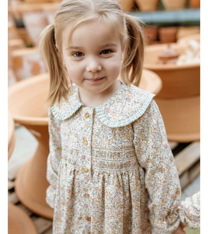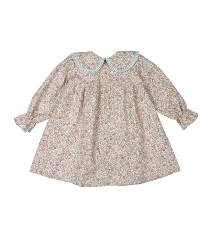 Vestido estampado flores cuello bobo viveado en vichy verde.